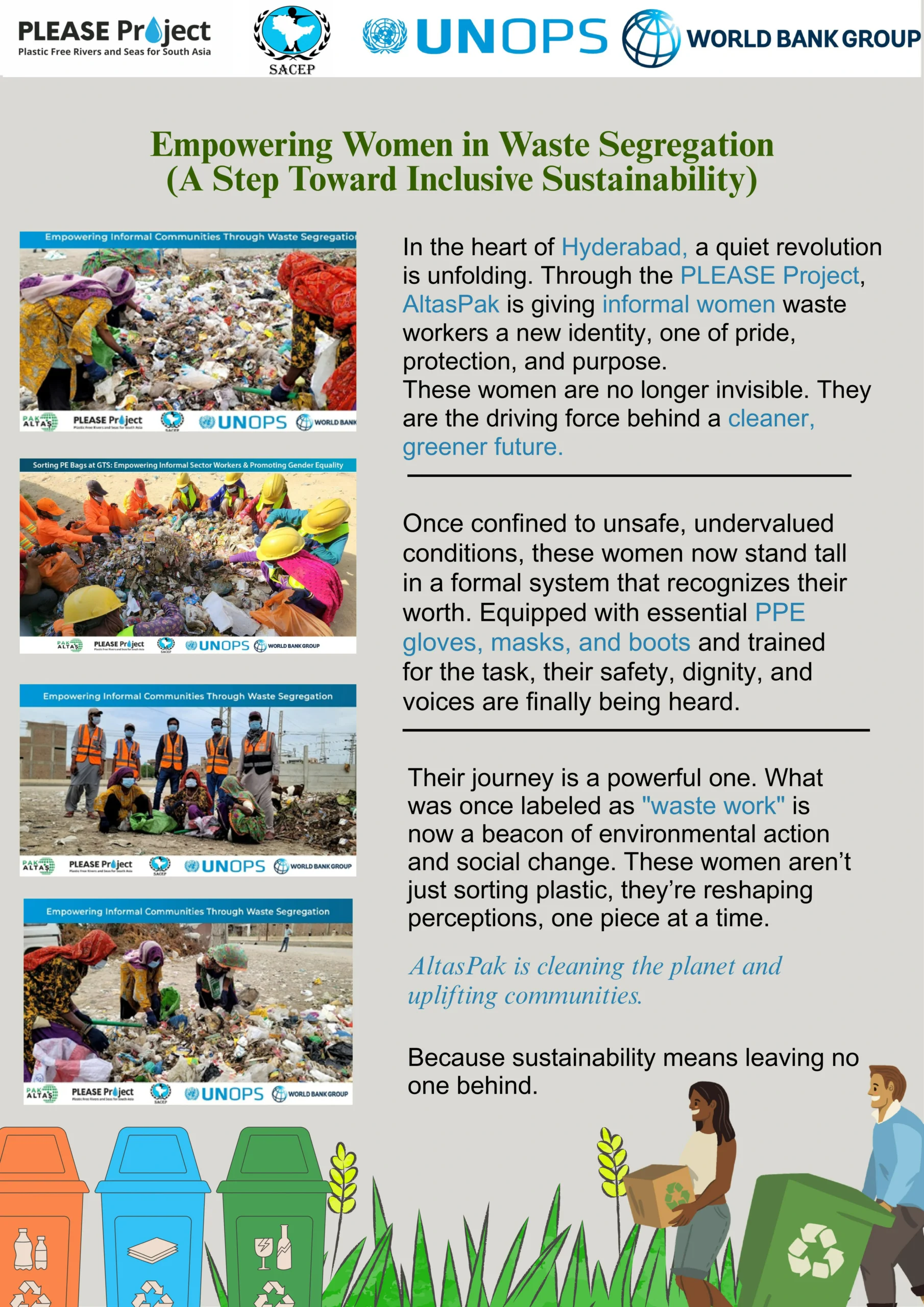 Altaspak– Installing the state-of-the-art PE Film Recycling Plant in Hyderabad District, Sindh. This innovative facility is designed to process 5 tons of plastic waste per day, following a rigorous process of plastic waste sorting, segregation, shredding, washing, and chilling. By implementing these advanced techniques, we can transform discarded PE plastic into valuable products, such as Plastic Manhole Covers. Altaspak Waste Management is committed to combating plastic pollution in South Asia and is a key participant in the Plastic Free Rivers and Seas initiative (PLEASE Project). Through our collaboration with SACEP, UNOPS, and the World Bank, we are responsible for creating a sustainable solution to the plastic waste crisis. Our project aims to divert significant amounts of plastic waste from landfills, promote a circular economy, and foster environmental conservation. The primary objectives of this project include: Establishing a self-sustaining waste management system in Pakistan, Preventing plastic pollution in rivers and seas, Reducing waste and conserving resources, Promoting and establishing a circular economy, Generating economic benefits, and raising public awareness about environmental issues.